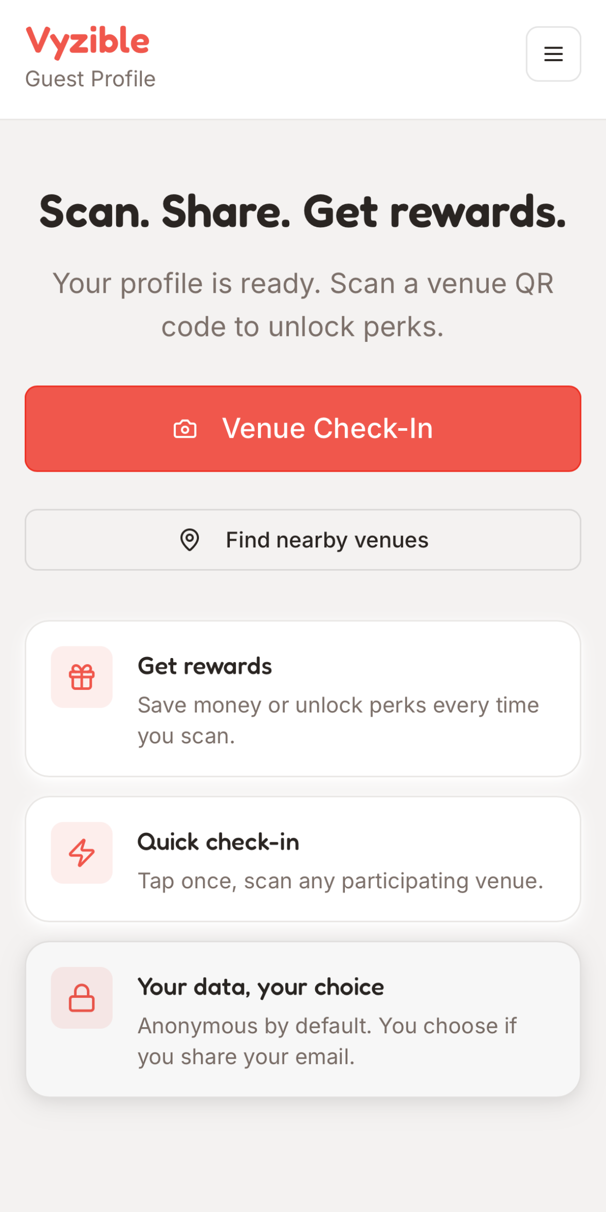 Stay anonymous by default, check in with a scan, and enjoy perks for helping venues do better.