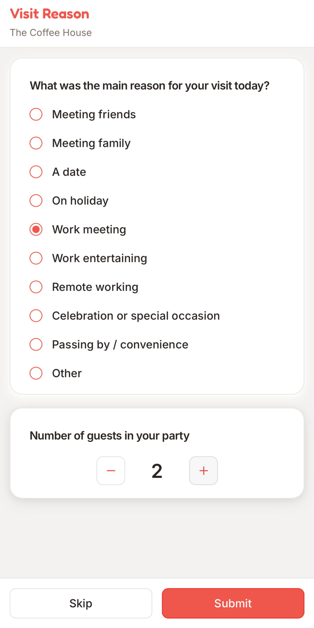 Tell the venue why you’re there, work, social, celebration or just passing by. This adds useful context without any extra effort.