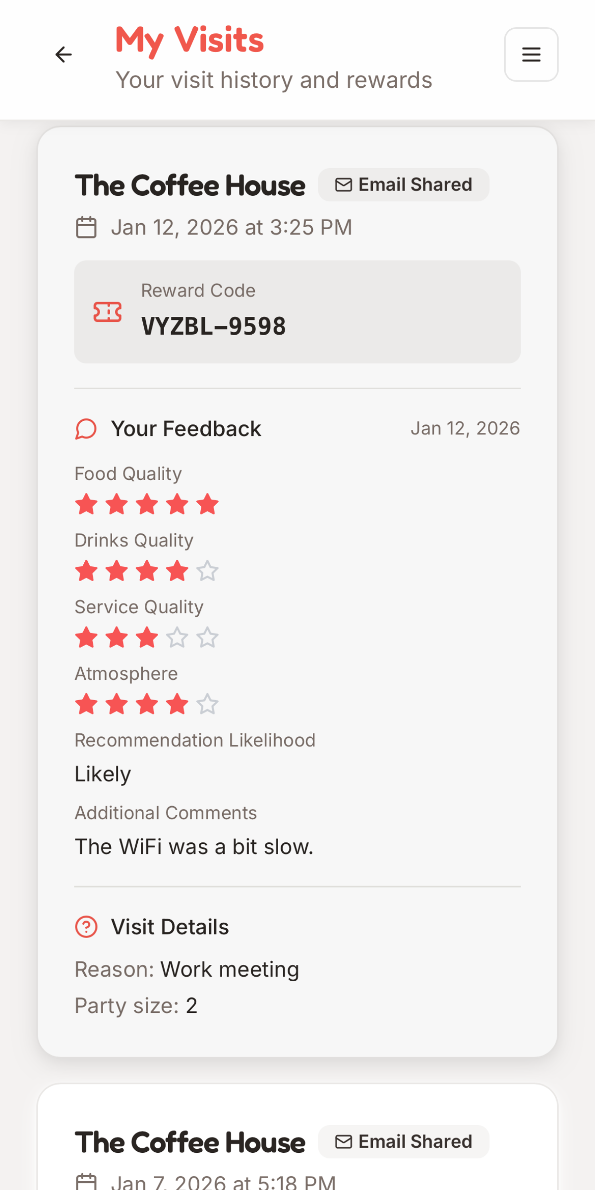 See your visit history, rewards and feedback in one place.