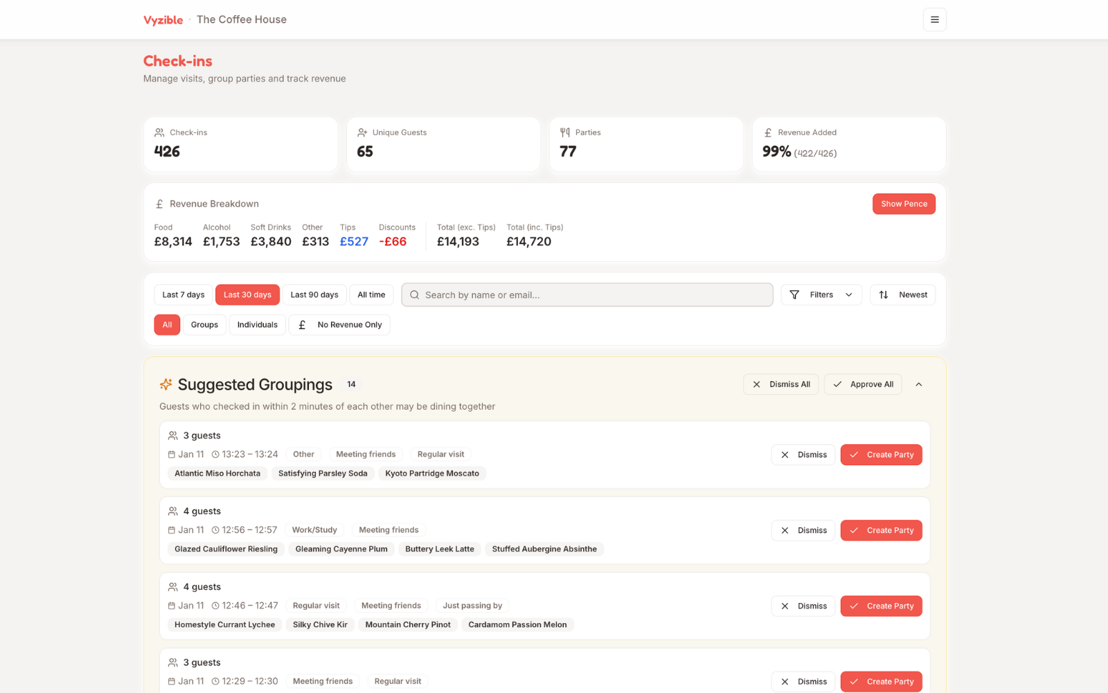 Track visits in real time, group guests into parties, and capture revenue where you choose.